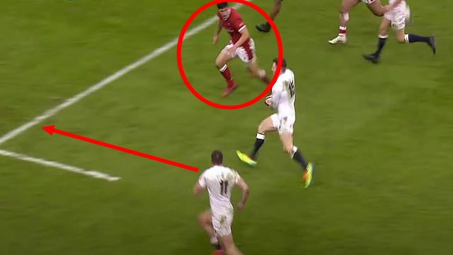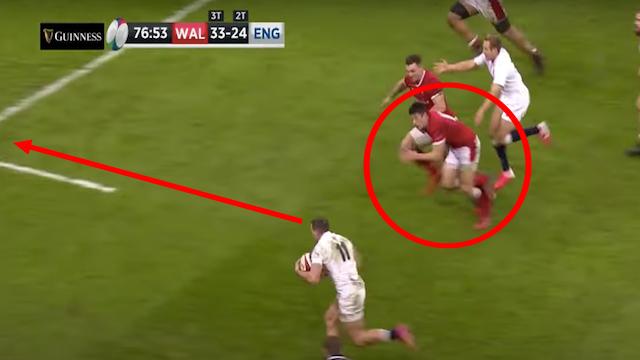 Même situation mais 15 minutes plus tard. Jonny May est cette fois décalé par Malins et Rees-Zammit trop court pour revenir sur son partenaire de club, qui file tout droit vers l'en-but. Heureusement encore pour les Gallois, c'est ce coup-ci North qui se battra jusqu'au bout pour reprendre l'ailier anglais. Sans conséquence, cette fois...