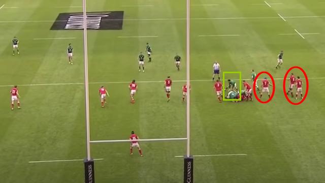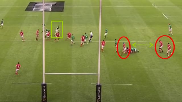 Ici, lorsque Murray (encadré en vert) libère, les Gallois Tipuric, Faletau et Williams (en rouge) sont très resserrés et surtout pas vraiment attentifs dans leur côté fermé.