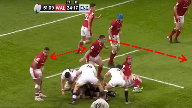 Si les errements gallois étaient sans conséquence sur le temps de jeu précédent, cette fois, ce n'est pas le cas. Il n'y a une nouvelle fois pas de garde axiale et ni Halaholo (à gauche) ni Dee ne regardent Youngs. Le demi de mêlée feinte la passe cette fois, et n'a plus qu'à s'engouffrer pour marquer.