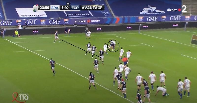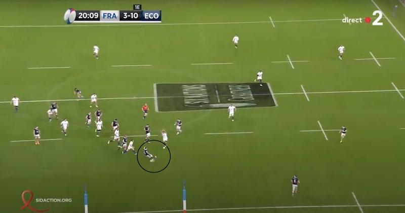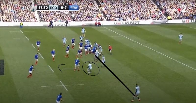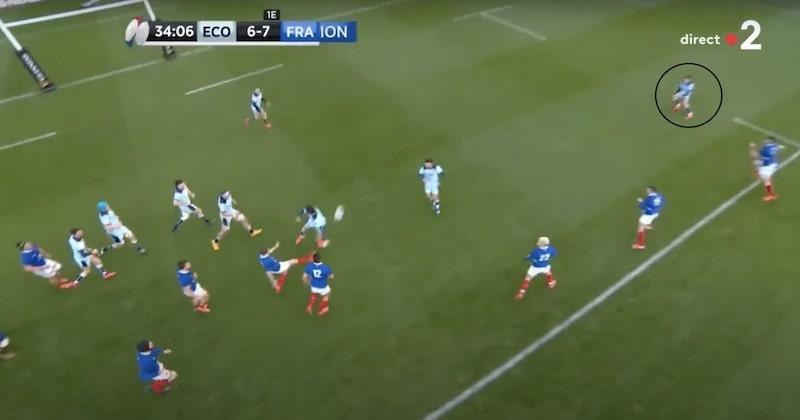Des prises de risque qui ont souvent fonctionné, les Bleus n'arrivant pas toujours à s'adapter à cela. Au contraire, on a vu lors de ces deux rencontres que Matthieu Jalibert et Romain Ntamack étaient assez perturbés par cela, les obligeant à conserver la balle. Et pourtant, des surnombres, il y en avait au large ! Et quand on connaît les qualités des ailiers présents sur la pelouse (Fickou et Penaud), on se dit qu'il y avait mieux à faire. Mais justement, les Écossais devaient également s'en douter, et c'est sûrement pour cela qu'ils ont mis en place ce type de défense. Pour éviter que les Bleus balayent le terrain, comme ils avaient su le faire face à d'autres nations comme l'Angleterre ou l'Irlande. On voit notamment sur cette deuxième image le trou laissé par la défense écossaise, qui ne sera pas exploité à cause de la montée en pointe de Hastings.