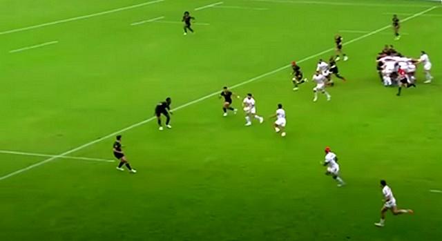 Sur le deuxième essai, c’est son alternance entre garder le ballon et passer qui lui permet de s’ouvrir une brèche. Sur l’action de son essai, il touchera 6 fois ballons en tout. Les 3 premiers sont des passes sans porter le ballon, une éjection rapide derrière le ruck. Mais dès lors que les Toulousains sont dans l’avancée, il porte le ballon sur deux pas après le ruck pour venir peser sur la défense avant de servir des avants lancés dans le sens. Il le fait sur le 4ᵉ et 5ᵉ ballon touchés. Sur le 6ᵉ, il porte une fois de plus le ballon sur deux pas, mais cette fois-ci il la bêche est là. Personne ne le rattrapera et s’en va inscrire le deuxième essai pour son équipe. En portant le ballon quand les Toulousains sont dans l’avancée, il oblige les deux premiers défenseurs au bord du ruck de garder un œil sur lui et donc de monter moins vite. Il peut ensuite ouvrir des espaces pour ses avants qui garderont l’avancée. En faisant jouer après lui sur les deux premiers rucks, il habitue les deux premiers défenseurs à ne pas défendre sur lui. Cela lui permet sur le 3ᵉ ruck, que les deux premiers défenseurs ne s’attendent pas à ce qu’il garde le ballon. Et grâce à sa lecture du jeu infaillible, lui le sait, il doit garder le ballon. Cette alternance entre éjecter le ballon rapidement derrière le ruck, porter et passer, et enfin porter et garder lui permet de mettre continuellement les défenses adverses dans l’incertitude. Même si la défense s’est adaptée à l’une de ses façons de porter, il la surprend encore avec deux autres manières.