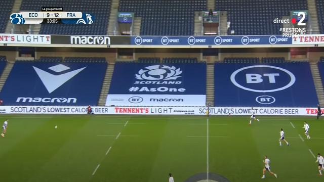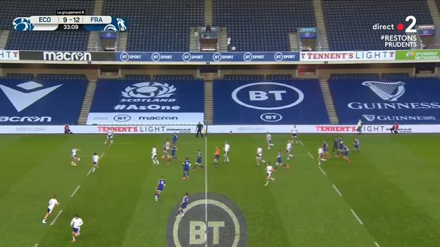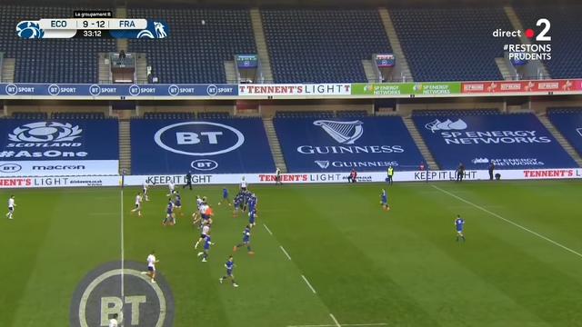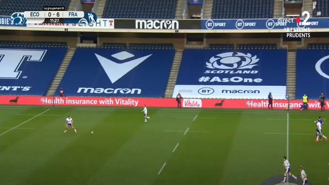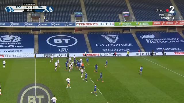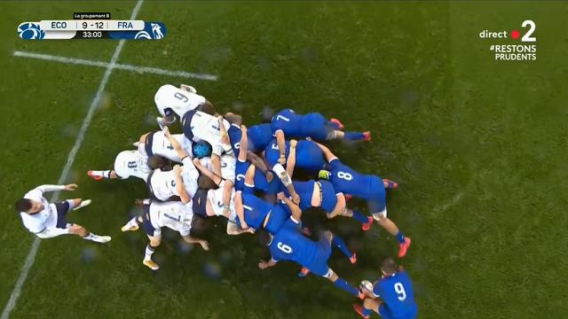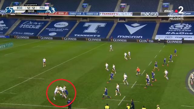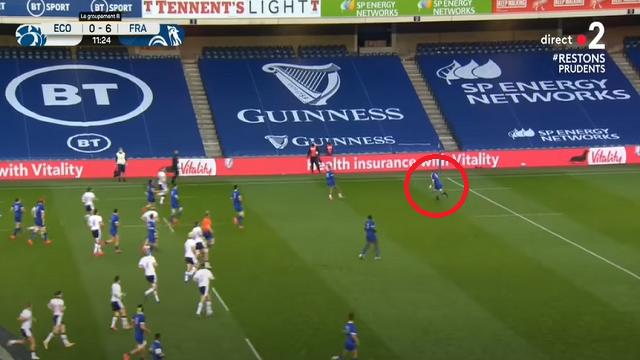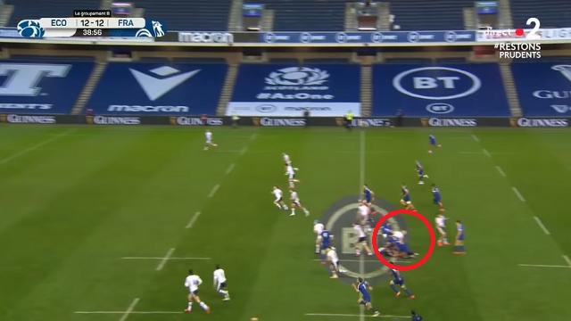 Si c'est l'un des seuls ballons avec de la pression à la retombée et en bord de touche, on voit bien que ce n'est pas forcément dans les dernières habitudes du demi de mêlée. Le ballon n'est pas forcément bon à jouer rapidement avec une défense écossaise en place. Mais les points d'impact français avec de bons soutiens offensifs pouvaient permettre aux Français d'avoir de bonnes rampes de lancement.