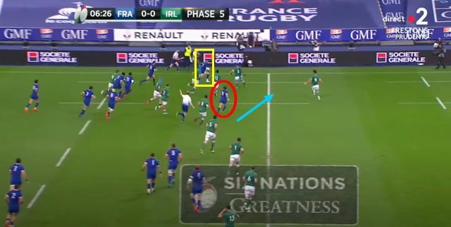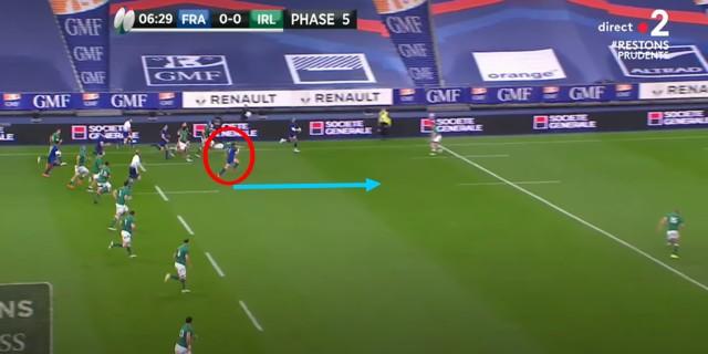 Sur cette attaque au large qui paraît bénigne, le jeu va jusqu'à l'aile de Fickou. Dupont (toujours encerclé en rouge) est encore largement devant le porteur de balle afin d'anticiper un maximum et son angle de course est représenté par la direction de la flèche bleue. En haut de l'image, l'ailier français déborde Andrew Porter et prend le périphérique.