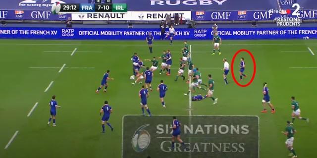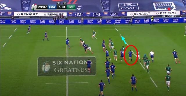 Après une touche sur la ligne médiane à la demi-heure de jeu, les Français optent pour une attaque au large. Après sa passe, l'on voit très clairement qu'Antoine Dupont (ici encerclé en rouge) continue immédiatement sa course non pas vers le ballon directement, mais plutôt vers l'extérieur et l'avant à la foi, dans la zone de "hors-jeu imaginaire" afin de prendre de l'avance sur une éventuelle percée d'un de ses coéquipiers. En fait, Dupont suit une trajectoire fictive qui correspond à là où pourrait arriver le ballon si d'aventure l'un de ses coéquipiers transperçait ou avançait significativement. Pour agir ainsi et à répétition, il lui faut donc une extrême rapidité d'analyse, une condition physique parfaite, une capacité d'adaptation éclair et, in fine, une connaissance parfaite des qualités de ses coéquipiers et des zones dites "fortes" de sa ligne d'attaque. Beaucoup de facteurs en soi.