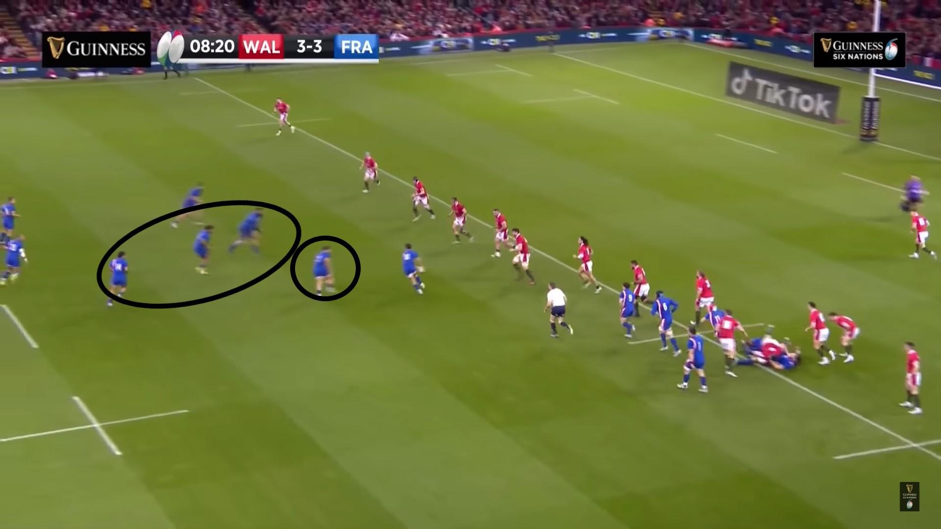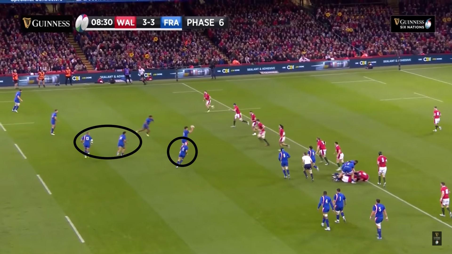 Après une percussion d'Alldritt, le jeu est transformé même sens. Villière est en solution intérieure pour obliger les défenseurs à ne pas glisser de suite. Danty possède deux joueurs derrière lui (Moefana et Fickou) comme solutions de jeu dans le dos. Danty utilisé en leurre, Fickou va gicler à hauteur de Moefana pour fixer son vis-à-vis et créer le décalage en bout de ligne. L'ailier gallois Alex Cuthbert ne peut pas monter en pointe pour contrer l'offensive, car il créerait derrière lui un espace énorme.