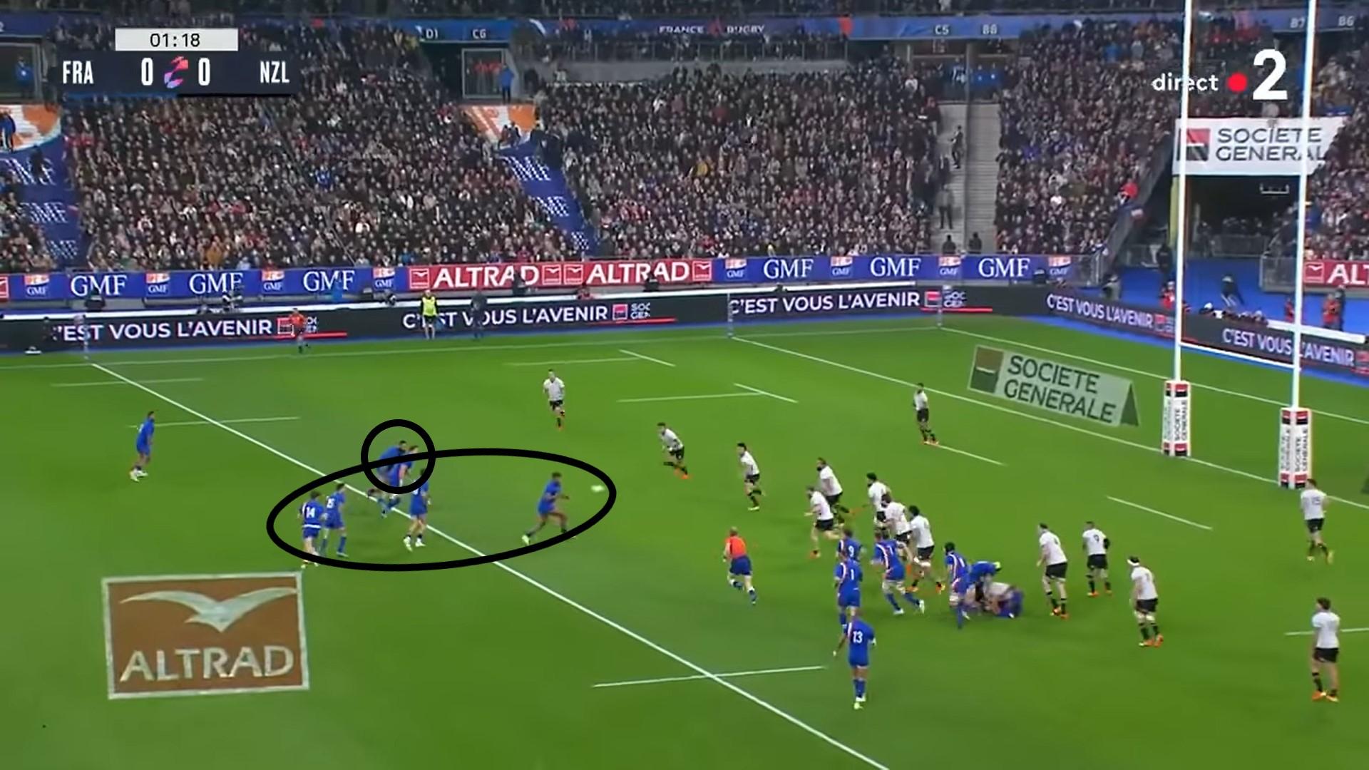 Jonathan Danty premier receveur. Derrière lui, Romain Ntamack, Melvyn Jaminet et Damian Penaud, positionnés ainsi pour mieux fixer les défenseurs néo-zélandais. Au lieu de jouer l'espace, les attaquants Bleus visent l'homme, pour mieux décaler le joueur en bout de ligne.