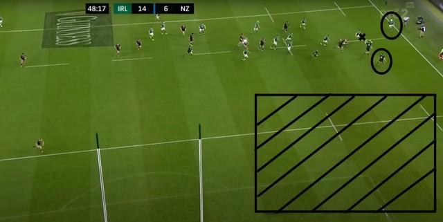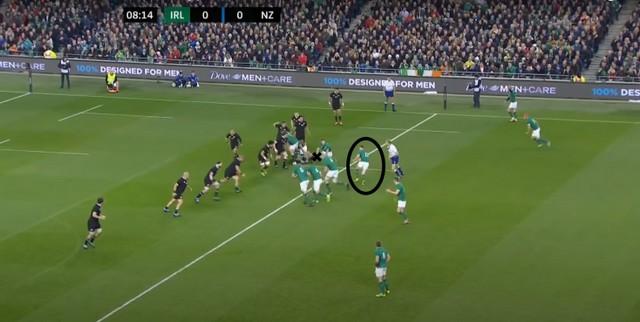 Après une succession de jeu à une passe dans le sens, Kieron Marmion (en possession du ballon, symbolisé par une croix), feinte le renversement et Ringrose (entouré en noir) appelle la croisée, pour exploiter un côté fermé où de l'espace est disponible. Cette action aurait pu donner un essai aux irlandais, elle s'est transformée en pénalité. Le but côté vert était d'arriver à proximité de l'en-but pour générer une grosse pression offensive, spécialité des hommes de Joe Schmidt qui avaient étouffés leurs adversaires de cette manière pour le gain du Grand Chelem en 2018.