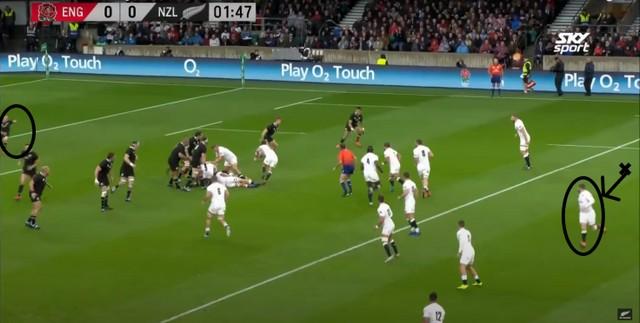 Au rugby, vous ne pouvez pas couvrir tout le terrain au même moment. Il arrive toujours un temps où vous vous exposez. Les Néo-zélandais adoptent une défense de manière à avoir le plus de joueurs répartis sur la largeur du terrain possible. Des plaquages à un ou deux, mais peu de grattages dans un premier temps pour rester en nombre derrière. Mais ils en oublient facilement leurs côtés fermés. Voyez ci-dessous par exemple :