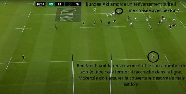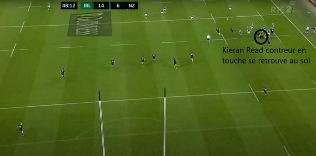 Revenons à Dublin pour l'essai de Jacob Stockdale désormais. Une touche raccourcie avec des avants dans la ligne d'attaque à hauteur de Sexton et Aki. Kieran Read tente de contrer le ballon en touche, mais échoue et tombe au sol. Il mettra du temps à se relever et son absence sera préjudiciable.